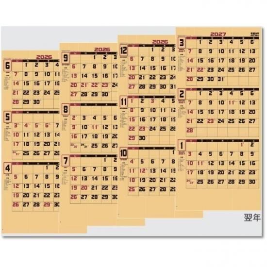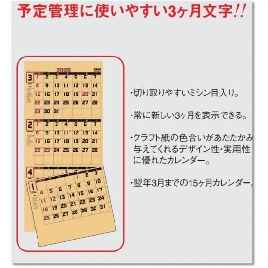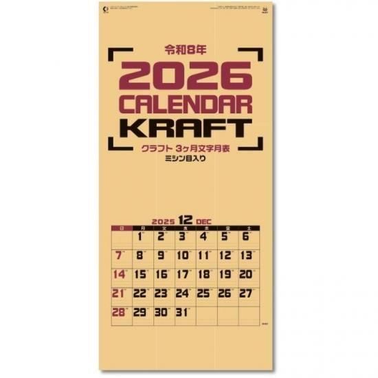 カレンダー 2026 壁掛け クラフト3ケ月文字(ミシン目入)