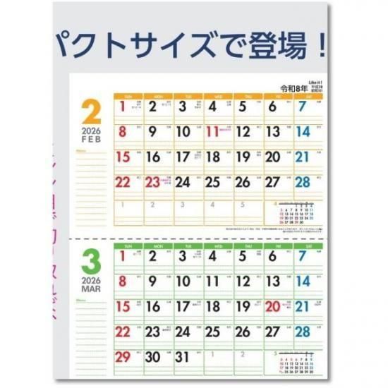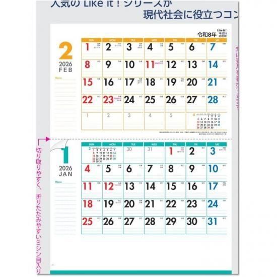 壁掛けカレンダー Likeit!smart(ミシン目入)2ヶ月 カレンダー 2026 壁掛け シンプル