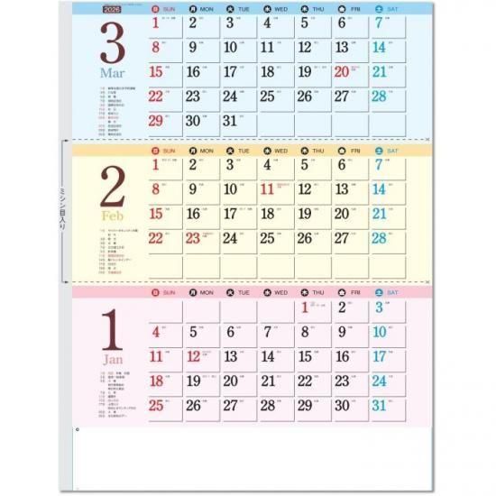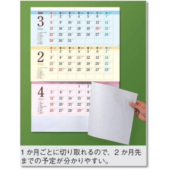 メモ蘭を広く、機能性を重視したカラフルな3か月文字月表。常に2か月先のスケジュールが書き込め、翌年3月まで使えます。一度使ったら手離せないカレンダーです。※天金具からホットメルトに変更になりました。